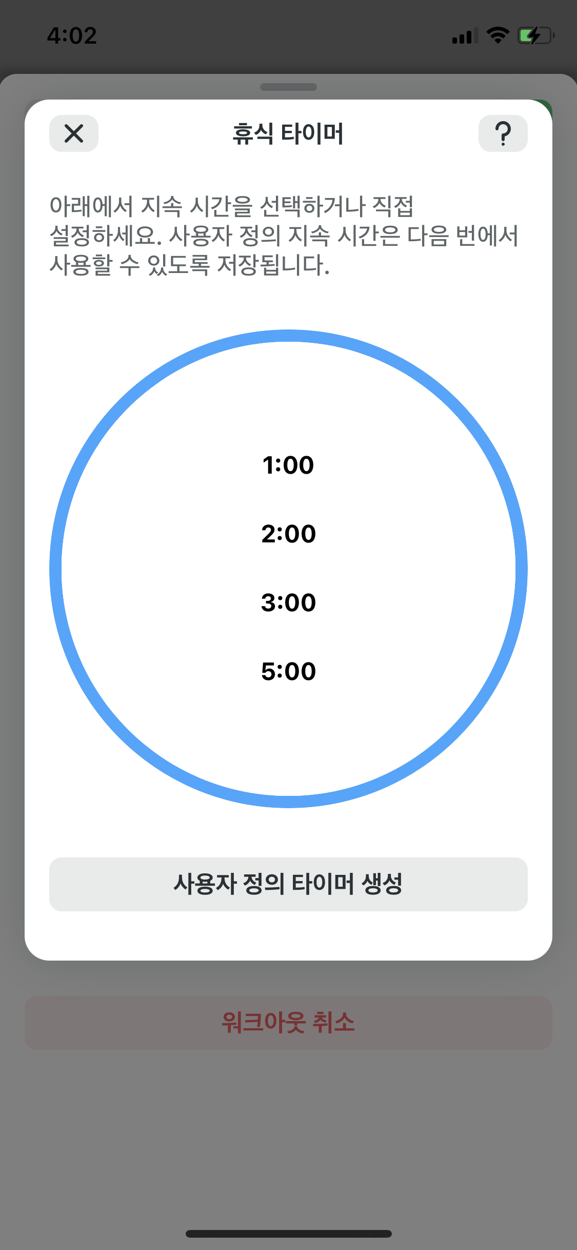 아래처럼 휴식 타이머도 있어서, 운동을 하고 쉴 때에도 시간을 정해두고 쉴 수 있습니다. 이 기능으로 괜한 시간 낭비도 줄이고, 운동 효과도 볼 수 있어서 너무 좋았습니다!