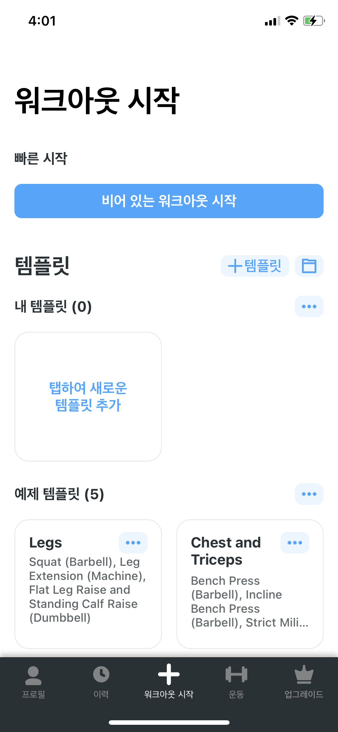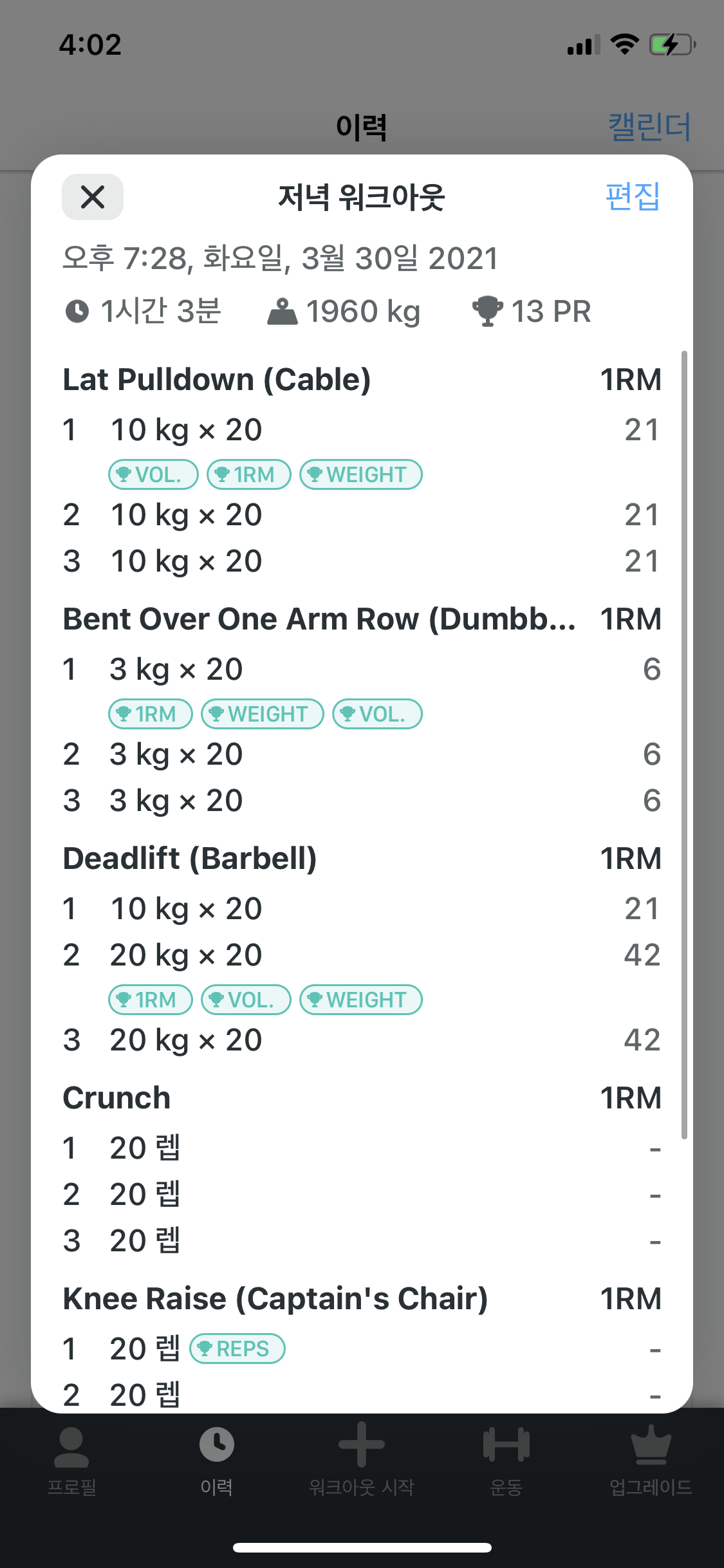 이렇게 열심히 운동을 하나하나씩 기록하면서 하다보면 벌써 저처럼 다양한 운동을 한 기록들이 보이게 됩니다.(아래 그림) 그러면 이 워크아웃의 루틴을 템플릿으로 저장해서 다음에도 똑같이 이용할 수도 있고, 아니면 그때그때 추가해서 새로운 워크아웃으로 운동 기록을 남길 수도 있습니다!