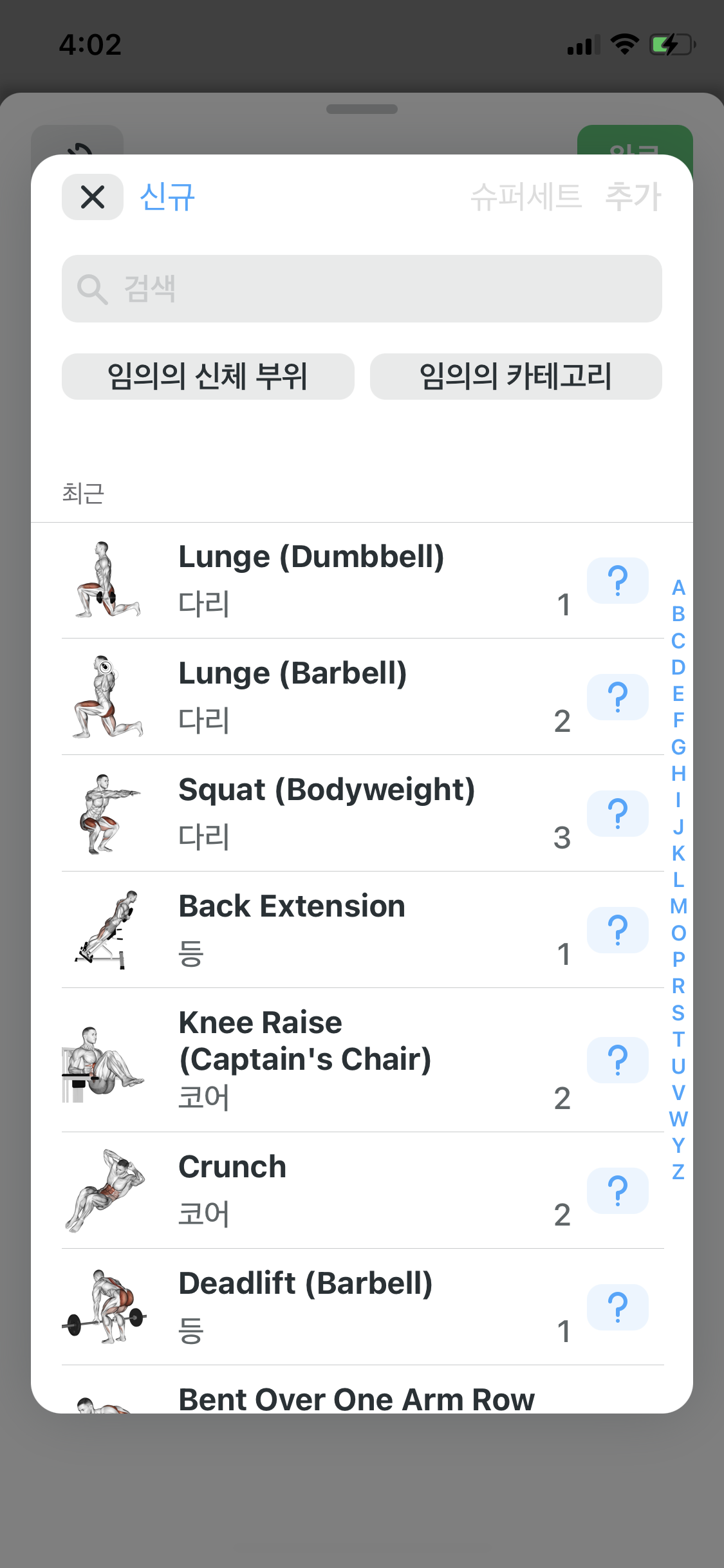 어떤 운동을 할 지 추가하기 위해서, 운동을 선택해 줍니다. 아래 보시면, 신체부위 별로도 찾을 수 있고 카테고리 별로도 어떤 운동을 할지 찾을 수 있습니다. 운동을 선택했으면 이제, 그에 맞게 횟수랑 무게를 지정하여, 각 세트별로 운동을 시작하시면 됩니다!
