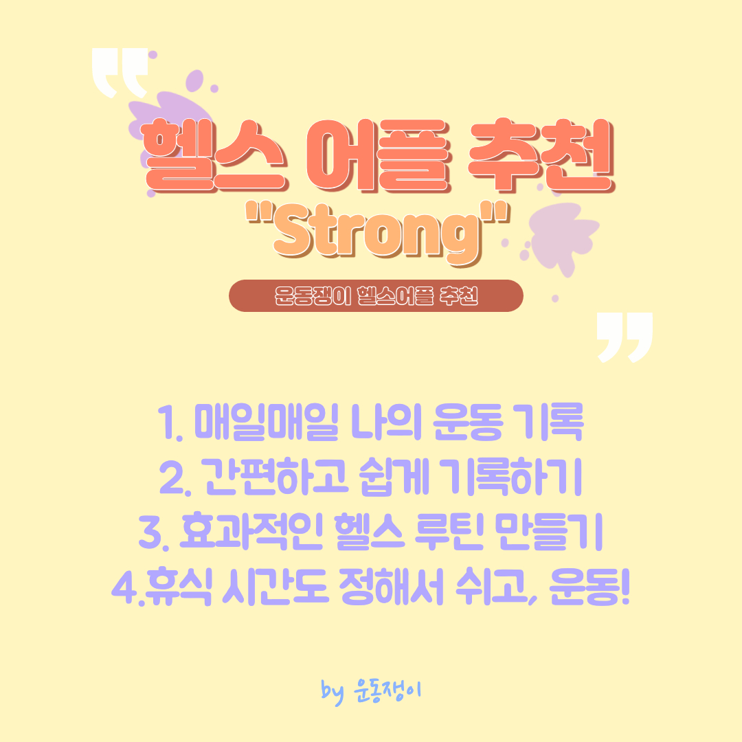 헬스를 할 때 똑똑하게 기록하면서 운동할 수 있는 Strong이라는 어플을 추천드려 보았습니다. 헬스 또는 다른 운동을 꾸준히 하는 것은 쉽지 않은 일입니다. 그렇지만 나의 달라진 모습과 건강해지는 모습을 스스로 기록하면서 운동을 한다면, 여기에서 또 다른 재미를 찾게 되고, 동기부여가 될 수 있다고 생각합니다. 이러한 건강한 동기부여들은 운동을 꾸준히 할 수 있는 원동력이 된다고 생각합니다! 그럼 오늘도 저는 strong을 켜고 운동하러 갑니다!