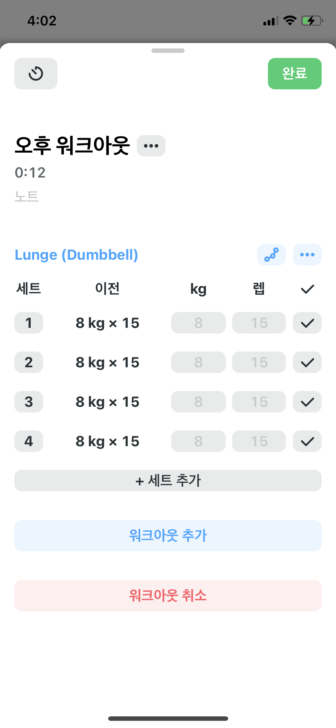 런지를 해당 무게외 횟수만큼 운동한 후에 옆에 체크 표시를 해 주면서 운동하면, 뿌듯한 기분도 느낄 수 있고 시간이 잘 간다는 느낌을 받으시면서 운동할 수 있습니다!
