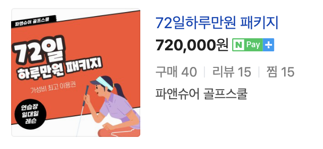 제가 제일 중요하게 생각하는 가성비! 파앤슈어 골프스쿨은 가성비 패키지가 많이 있습니다. 그중에서도 제가 지금 사용하고 있는 이용권은 72일 하루 만원 패키지로, 72일 동안 무제한으로 이용할 수 있습니다. (하루에 갈 때마다 만원 차감은 아님, 기간제임) 그리고 중간에 개인적인 일 때문에 잠시 홀드 해야 하면, 홀딩 신청할 수 있습니다. (최대 1주일 정도) 72만 원 패키지 안에는 8회 30분 프로님 레슨이 포함되어있어서 강남의 다른 곳과 비교해 보았을 때도 가성비가 훌륭한 상품이라고 생각합니다! (다른 곳은 15분씩 봐주는 패키지가 대부분이더라고요)