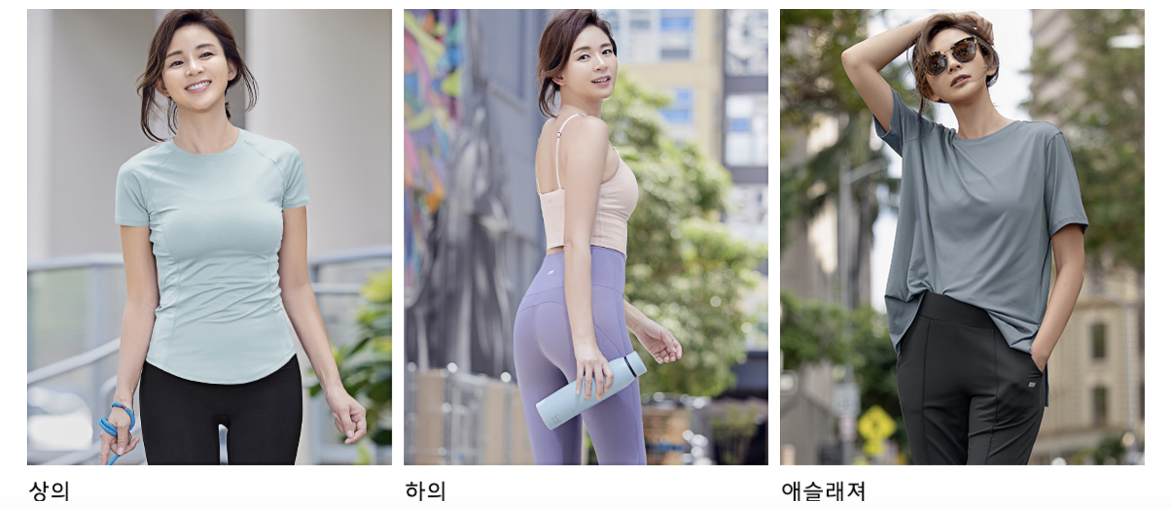 야노시호 착장처럼 기본 베이식 디자인으로 구성되어있는 상의, 하의, 그리고 에슬래져 제품! 상품 수량이 많아서 찾는 상품이 있을 확률이 높다는 것도 장점입니다! 가격이 착한데, 퀄리티도 나쁘지 않습니다. 착용 핏도 예뻐서 손이 자주 가는 제품들 입니다! 그리고 저는 빨래하기 귀찮은 비싼 운동복들 보다 손이 많이 가더라고요! 만만하게 입고 운동하기에 아주 적격입니다!